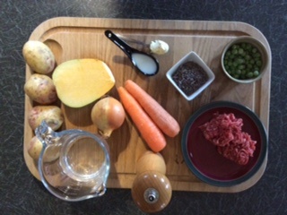 - Brown the mince in a saucepan, add onion, turnip and carrots.