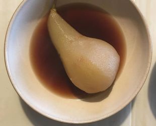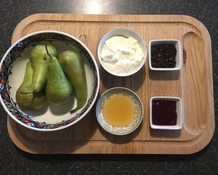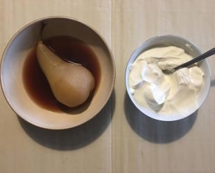 - Place all ingredients in a pan (except the crème fraiche) and poach gently for 10 minutes till pears are tender.