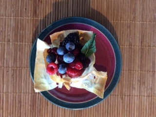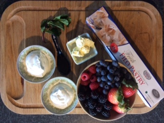 7. Divide fruit between filo tartlets and top with yoghurt mix.