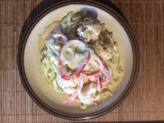 - Add chilli sauce, cream cheese and lime juice and zest, heat through.