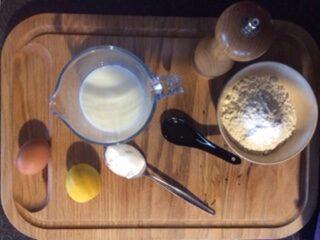 1. Place flour and salt in mixing bowl, add egg and half the milk. Beat mixture until smooth.