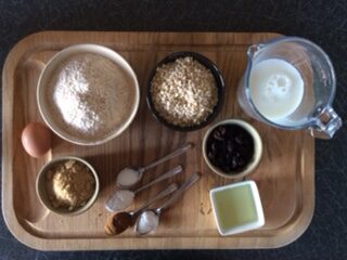 - Mix flour, cinnamon, baking powder, bicarbonate of soda, salt and raisins.