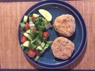 - Dip the fish cakes in the egg, followed by the breadcrumbs until coated on all sides.